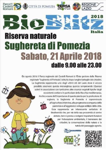 Sabato 21 aprile 2018 nella Riserva Naturale Regionale “Sughereta di Pomezia”con il patrocinio del Comune di Pomezia, il Parco Castelli Romani con la collaborazione di CURSA - Consorzio Universitario per la Ricerca Socioeconomica e per l’Ambiente e il supporto del Comitato Nazionale “BioBlitz Italia” organizza un evento Bioblitz. Per tale iniziativa è stato inoltre attivato uno specifico Cantiere Scuola Lavoro con l’I.I.S. “Blaise Pascal” di Pomezia (ottobre 2017-aprile 2018).All’evento parteciperanno, oltre al personale del Parco Castelli Romani, anche Tecnici e Guardiaparco del Sistema delle Aree Protette del Lazio, Ricercatori universitari, esperti Naturalisti di Società scientifiche, produttori del marchio regionale “Natura in Campo” per consentire la conoscenza enogastronomica dei prodotti tipici delle aree naturali protette del Lazio.Un evento Bioblitz è un’iniziativa di valenza scientifica e culturale (che in questa edizione ha la durata di 16 ore continuative) in cui scienziati volontari, famiglie, studenti, insegnanti e altri membri della comunità, organizzati in gruppi e in turni di 2 ore (dalle 10:00 alle 23:00), lavorano insieme in Natura, per trovare e identificare il maggior numero possibile di specie di piante, animali, funghi e microrganismi.Inoltre un evento Bioblitz persegue i seguenti obiettivi:· Realizzare un’esperienza “memorabile” per i partecipanti, promuovendo “attaccamento al luogo” e stimolando la partecipazione alla sua conservazione e tutela.· Svolgere un’azione incisiva di “comunicazione sociale”, veicolata anche attraverso le amministrazioni, le università e le associazioni.· Far incontrare i cittadini più giovani con ricercatori e scienziati: l’evento BioBlitz permette di raccogliere informazioni di base su alcuni gruppi sistematici di specie e incoraggia le persone a relazionarsi con scienziati e ricercatori che lavorano sul campo, ricevendone anche importanti stimoli di “orientamento professionale”.