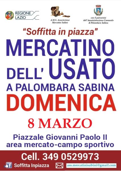 Palombara Sabina, Domenica 8 Marzo (dalle 8:00 alle 15:00) presso l’area mercato (P.le Giovanni Paolo II°) per chi usa il navigatore mettere Viale Tivoli, c’è il mercatino “Soffitta in Piazza” evento organizzato per favorire disoccupati, precari del lavoro, pensionati a basso reddito e privati cittadini che vogliono reagire con dignità al momento di crisi attuale privandosi di oggetti, vestiti ecc. che non usano più partecipando in questo simpatico contesto sociale.